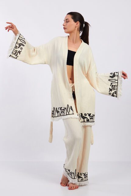 Kimono-Set aus Baumwoll-Musselin mit Hethitermuster und Steindruck